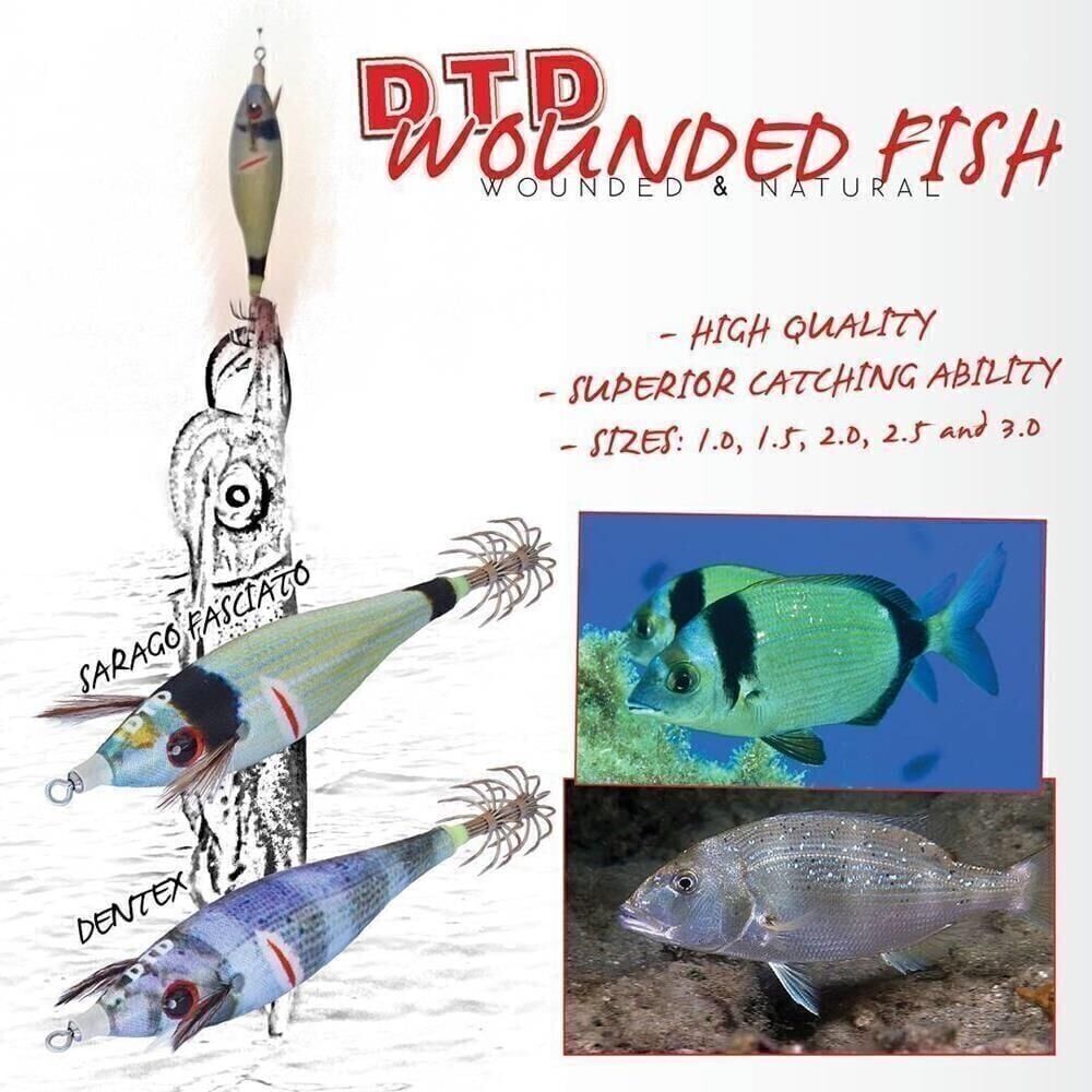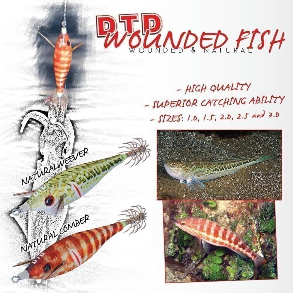 Doğal renklere sahip Dtd kalamar jigleri , Dtd Wounded Fish , su kristal berraklığında olduğunda kalamar avcılığı için idealdir , çünkü yaralı bir balığı simüle eden doğal renkleri ile herhangi bir kafadanbacaklıyı çok kolay çekerler.