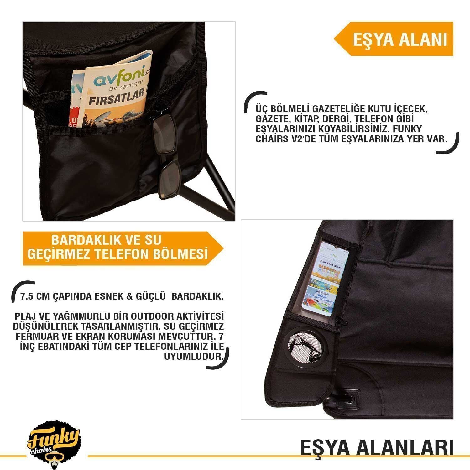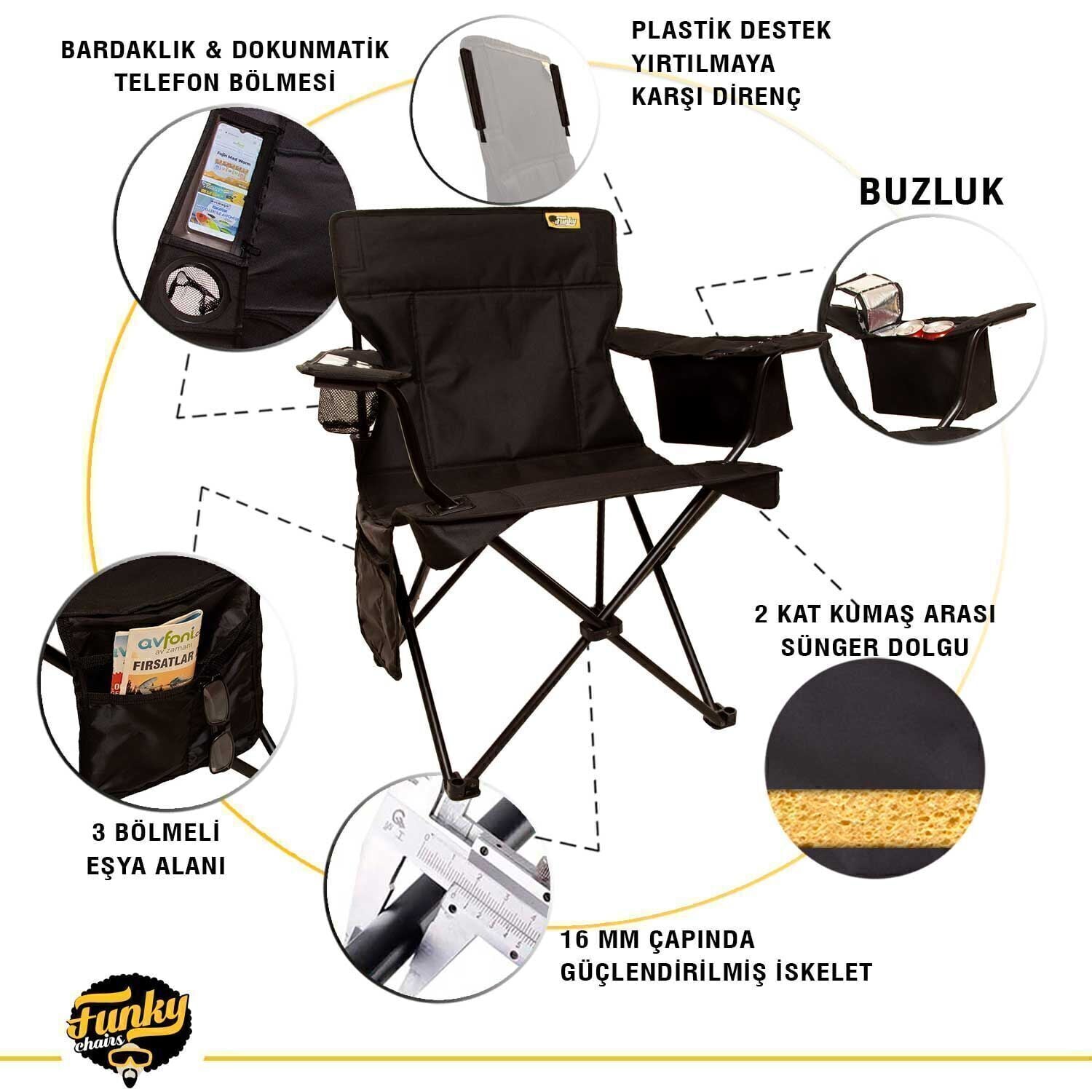 Funky Chairs Cool Ice Siyah Lüks Kamp Sandalyesi, outdoor yaşamda rahatlık arayanlar için özel olarak tasarlanmış güçlü ve konforlu bir kamp sandalyesidir. Geniş oturma yapısı, destekli sırt bölümü ve dayanıklı çelik gövdesi sayesinde uzun süre kullanımda bile yüksek stabilite sunar.