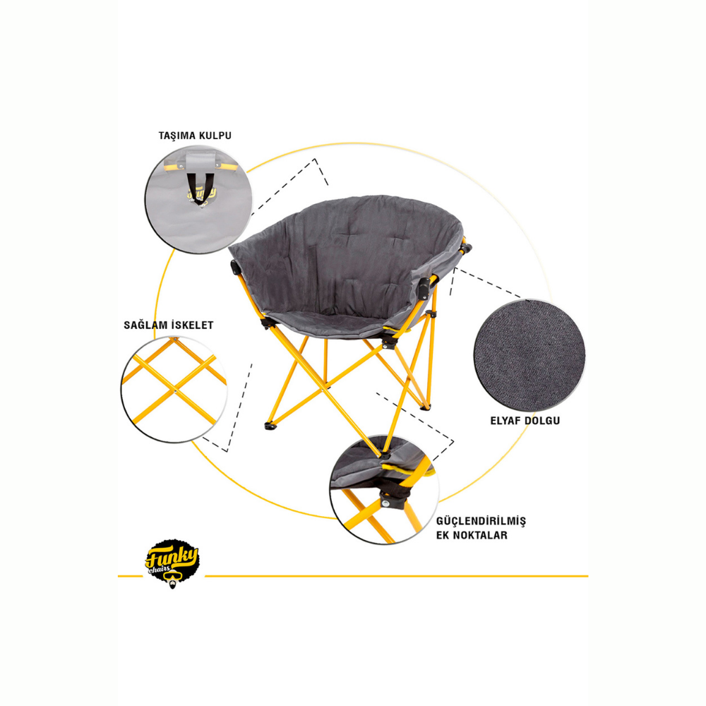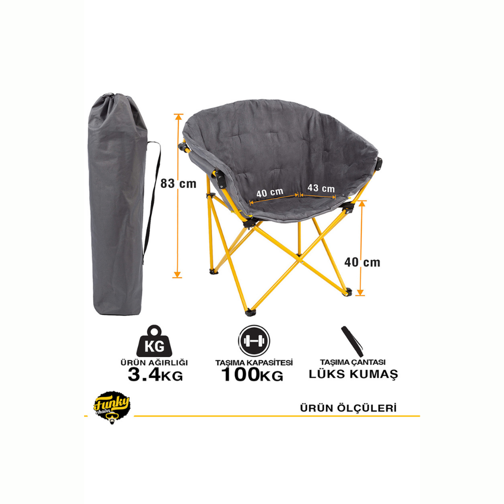 Funky Chairs Moon L Kamp Koltuğu, outdoor aktivitelerinde rahatlığı artırmak için tasarlanmış modern bir oturma çözümüdür. Geniş oturma yüzeyi, vücut şeklini destekleyerek uzun süreli kullanımlarda bile konfor sağlar. Dayanıklı kumaş yapısı ve güçlü iskeleti, kamp, piknik, festival ve sahil gibi farklı ortamlarda güvenilir bir kullanım sunar.