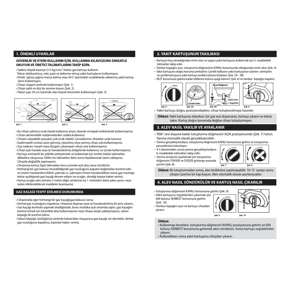Gaz stop emniyet özelliği sadece 227 gram gaz kartuşları ile çalışır tüp bağlantısı gerçekleşmemektedir.