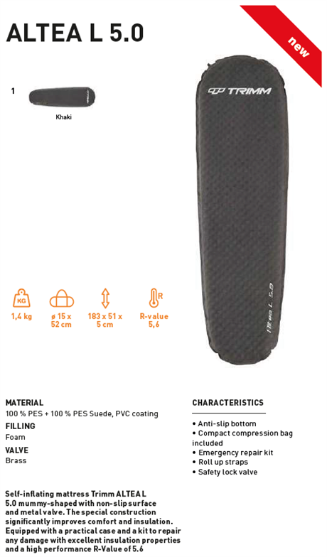 Farklı ihtiyaçlara yönelik şekilde Lite, Trekking ve Comfort olarak 3 seri altında listelenmiş Trimm şişme matlarla outdoor faaliyetlerinizi daha keyifli hale getirin. Trimm şişme matlar, konforlu bir uyku için gereken en uygun biçimlere sahip olup üst düzey dayanıklılık sağlayan malzemelerle üretildi.