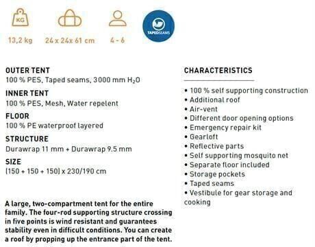 Aileniz veya arkadaş grubunuz için büyük, 2 yatak odalı ve 1 oturma odalı bir kamp çadırı modelidir. 5 Noktadan geçen 4 pollü taşıyıcı sistemi rüzgar dayanımını artırır. Çift katmanlı yapısı sayesinde 3 mevsim şartları için gerekli su geçirmezliğe sahiptir. Giriş kısmında yer alan tente, oturma odasına eklemlenerek işlevselliği artırır.