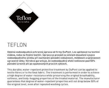 Teflon™ ile desteklenmiş kumaş %40’a kadar daha hızlı kurur, %50’ye kadar daha düşük sıcaklıkta yıkanabilir ve kire karşı direnç göstererek giysinin yeni kalmasını sağlar.