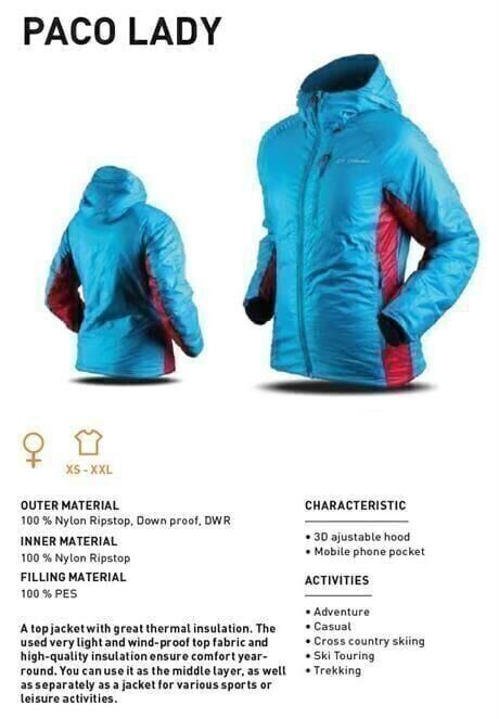 Trimm Paco, hem orta katman hem de uygun şartarda dış karman olarak değerlendirebileceğiniz hafif ve konforlu bir ceket modelidir. Kaz tüyü muadili Dupont™ Sorona® dolgu malzemesi sayesinde, kaz tüyünün olumsuz özelliklerini taşımadan yüksek ısı yalıtımı ve hafiflik sağlar. Elit outdoor üreticileri tarafından tercih edilen Sorona® Aura kumaş nefes alabilir yapıda olmasına karşın rüzgar kesici özellik gösterir.