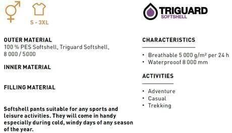 Trimm Sigma, günlük olarak veya doğadaki faaliyetlerinizde güvenle kullanabileceğiniz bir outdoor pantolon modelidir. Triguard Softshell malzemeden üretilen ürün 8.000 mm su geçirmezlik ve 5.000 g/m² nefes alabilirlik değerlerine sahiptir. Ürün özellikle soğuk, yağışlı ve rüzgarlı havalarda etkili koruma sağlar.