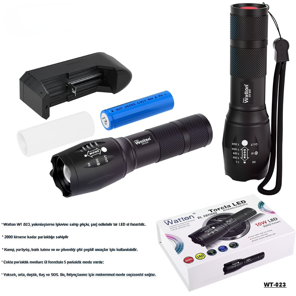 Outdoor aktivitelerini sevenler için geliştirilen Watton En Güçlü Şarjlı El Feneri WT-023, kamp, doğa yürüyüşü, avcılık, balıkçılık ve acil durum senaryolarında maksimum verimlilik sağlar. Zoom özellikli yapısı, yakın ve uzak aydınlatma arasında hızlı geçiş yapılmasına olanak tanır.