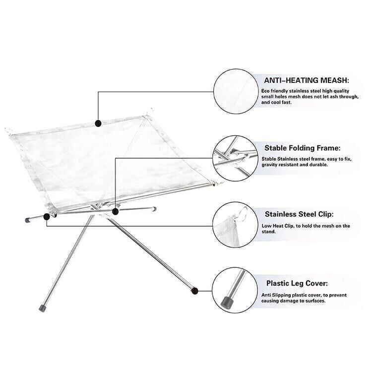 【Çevre dostu ve tekrar kullanılabilir】Dış mekan şömine ağı ısıya dayanıklı, çevre dostu ve ısıya dayanıklı paslanmaz çelik malzemeden yapılmıştır. Ağ çok yoğundur. Isıya dayanıklı ağ, toz veya döküntülerin düşmesini önler. Her kullanımdan sonra artıkları ve külleri atın! Bu nedenle, aileniz ve arkadaşlarınızla açık havada kamp ateşinin tadını çıkarmak için temizlik yapmak ve daha fazla zaman kazanmak kolaydır! Kauçuk kapaklı dört çelik boru daha güvenilir destek ve stabilite sağlar. Plastik bacak kapakları herhangi bir yüzeye zarar gelmesini önleyebilir ve şenlik ateşi rafının servis ömrünü uzatabilir.