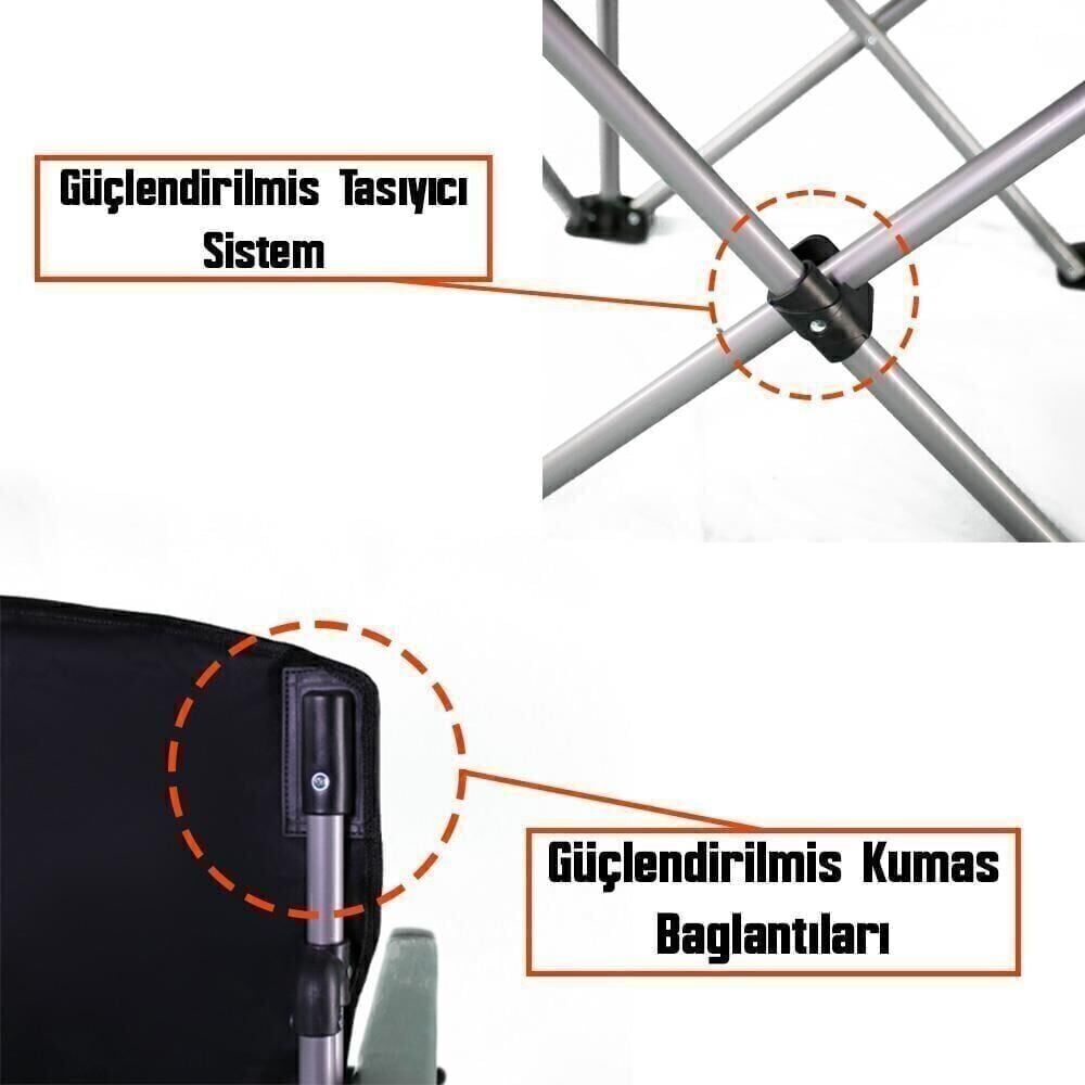 * Kamp sandalyesi, 22 mm kalınlaştırılmış çelik boru çerçeveden ve yırtılmaya karşı dayanıklı çift katmanlı 600D oxford kumaştan yapılmıştır ve bu katlanır sandalyeye Maksimum Yük 150.0kg sağlayabilir