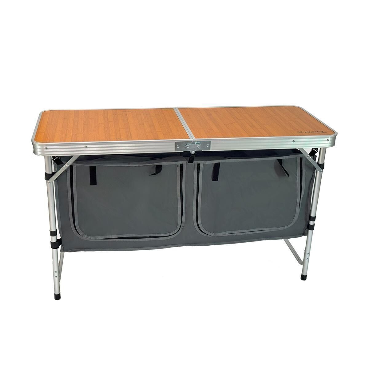 Kurulumu ve toplaması kolay, son derece sağlam ve son derece hafif, katlanır tablalı ve yüksekliği ayrı ayrı ayarlanabilen ayaklara sahip hafif alüminyum katlanır kamp masası.