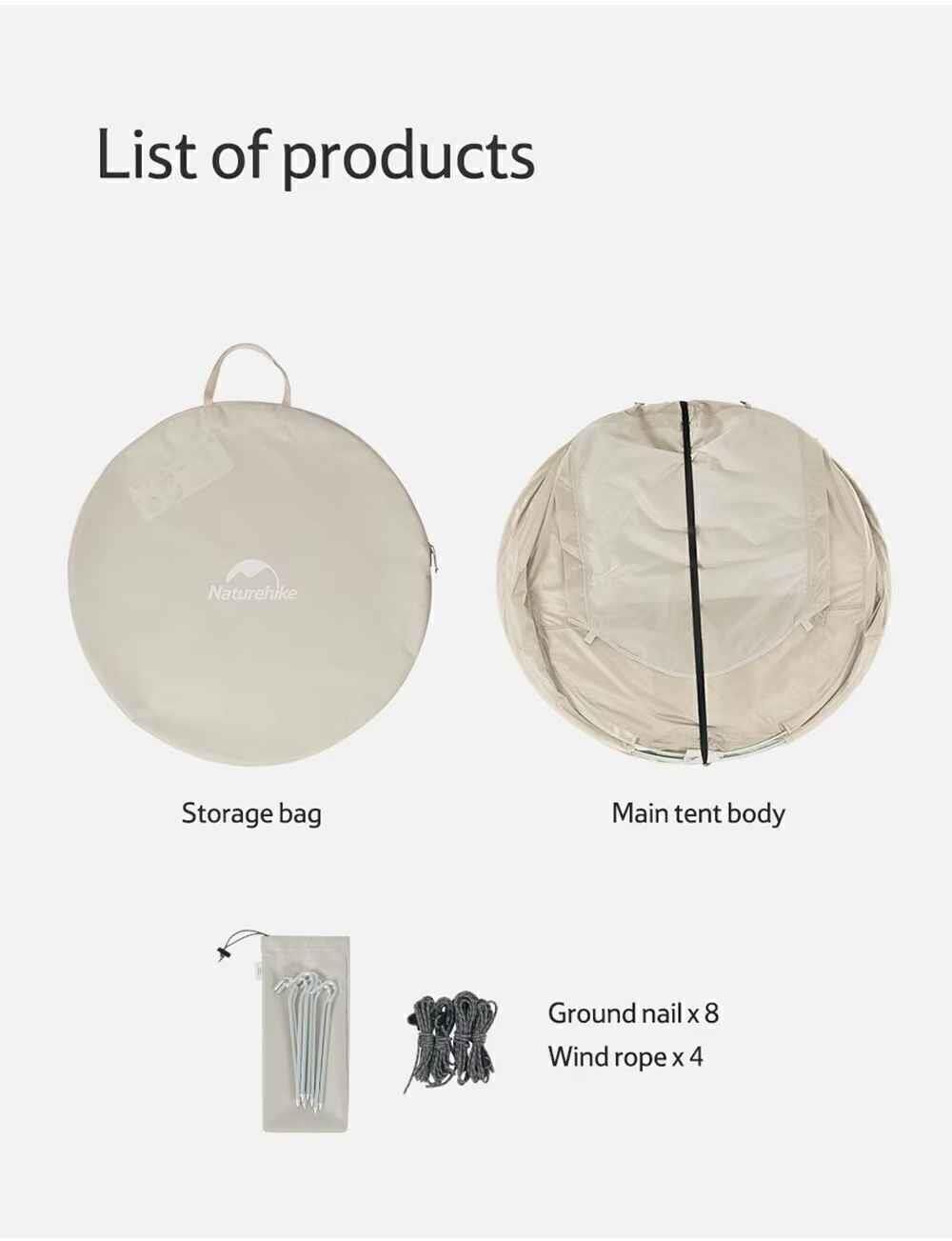 Ürün Listesi: Çadır gövdesi, saklama çantası, 8 adet toprak çivisi, 4 adet rüzgar ipi