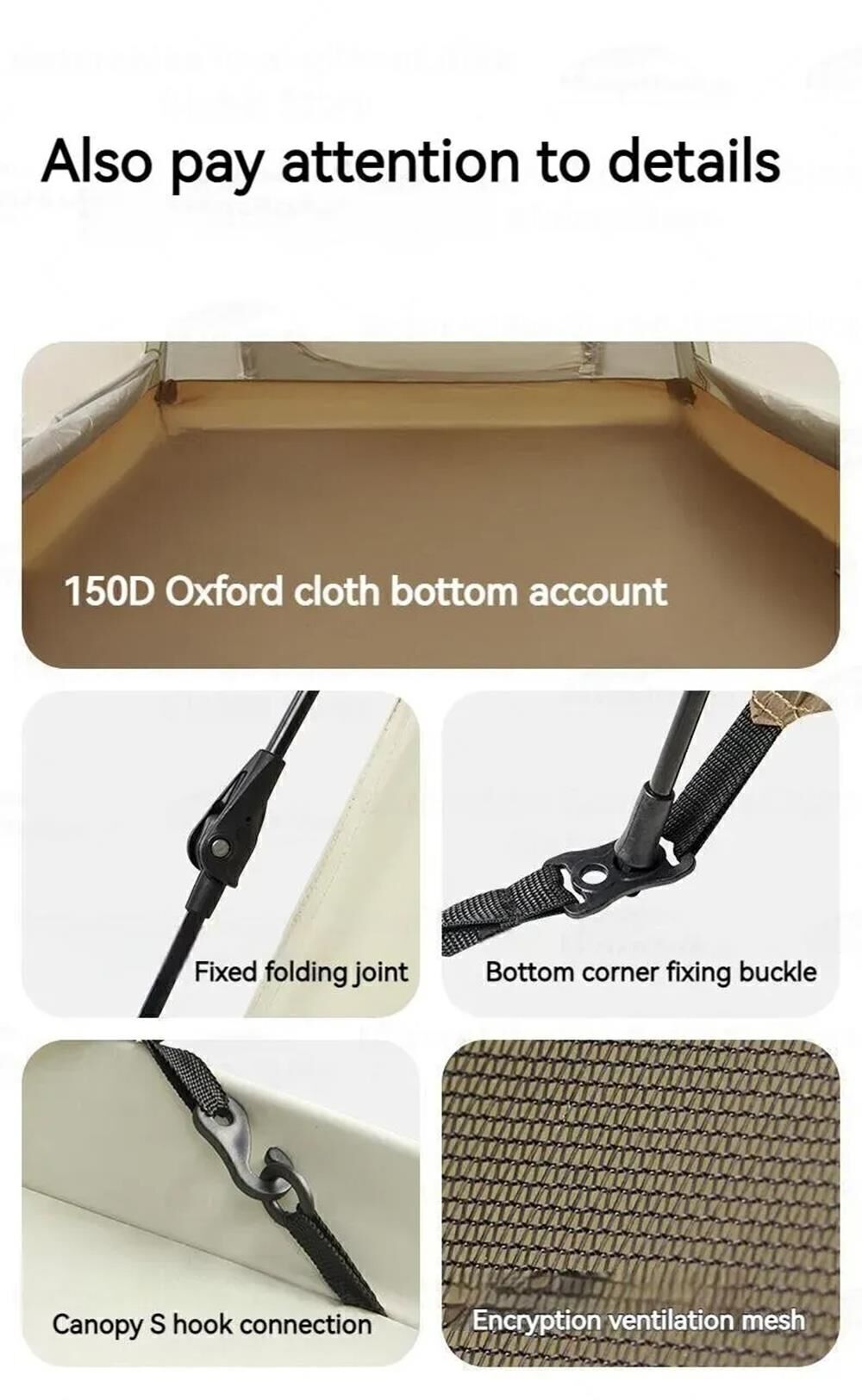 Dayanıklı Tente Kumaşı : Hava koşullarına karşı ekstra dayanıklılık için siyah tutkal kaplamalı 150D Oxford kumaştan üretilmiştir.Bu çadır, hızlı kurulum, geniş alan ve dış etkenlere karşı dayanıklı koruma sunarak kamp gezileri için mükemmeldir.