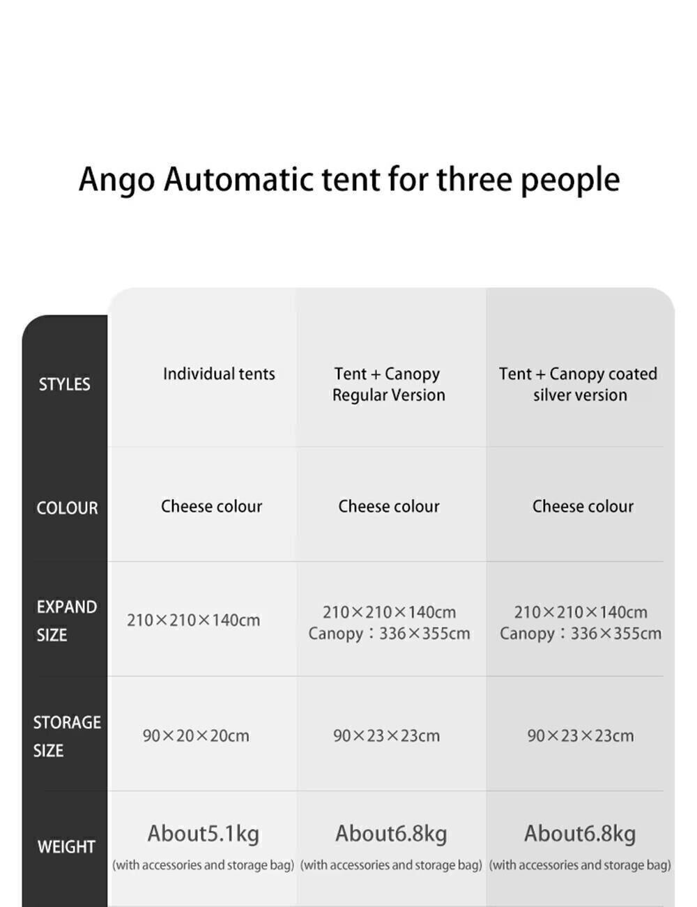 3 kişi için tasarlanmış ANGO All-in-One Otomatik Tenteli Çadırın rahatlığını ve konforunu deneyimleyin. Bu hızlı açılan kamp çadırı, dış çadır için yüksek kaliteli polyester ve çadır tabanı için 210D Oxford polyester kullanılarak üretilmiştir ve dayanıklılık ve hava koşullarına dayanıklılık sağlar. 1500 mm ila 2000 mm su geçirmezlik endeksiyle, elementlere karşı güvenilir koruma sağlar. Geniş iç mekan ve büyük tente, bol miktarda alan ve gölge sağlayarak onu açık hava maceraları için mükemmel hale getirir. Kurulumu kolay ve taşınabilir, aksesuarlar ve saklama çantası dahil yaklaşık 9 kg ağırlığındadır.