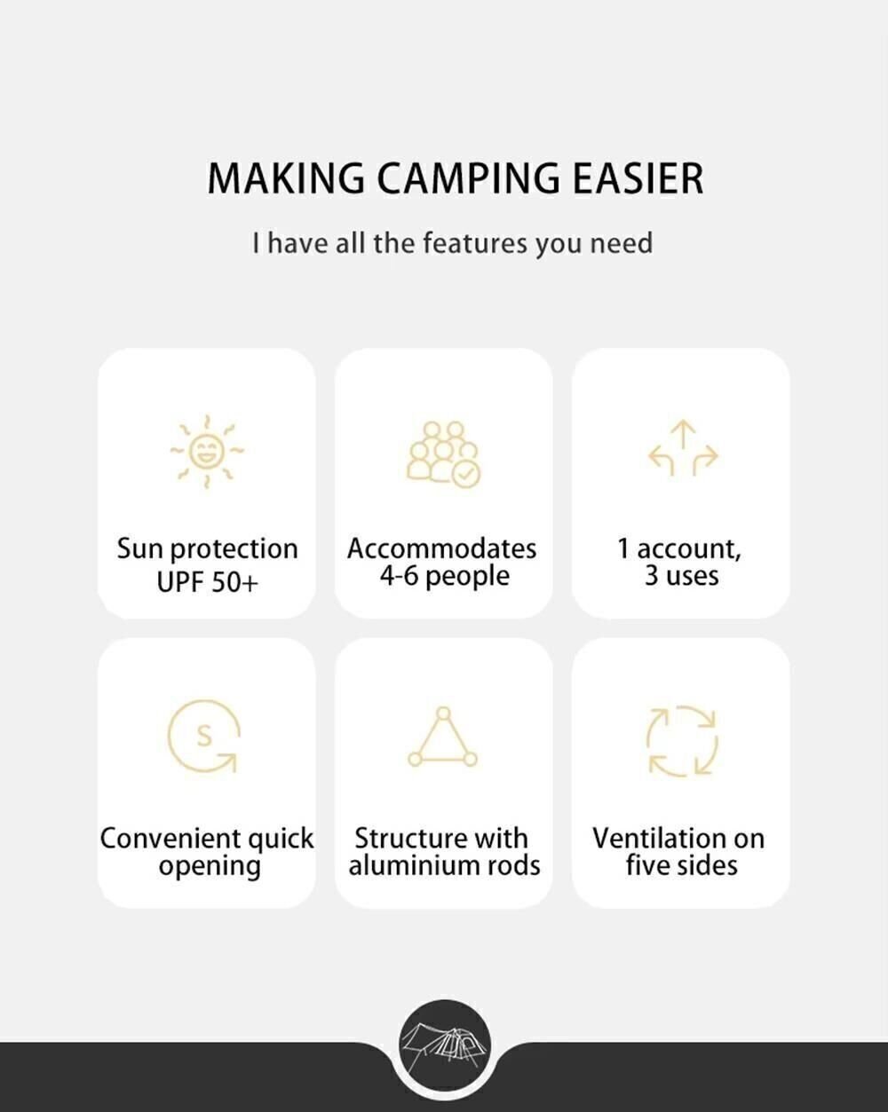 Bu çadır, hızlı kurulum, geniş alan ve dış etkenlere karşı dayanıklı koruma sunarak kamp gezileri için mükemmeldir.