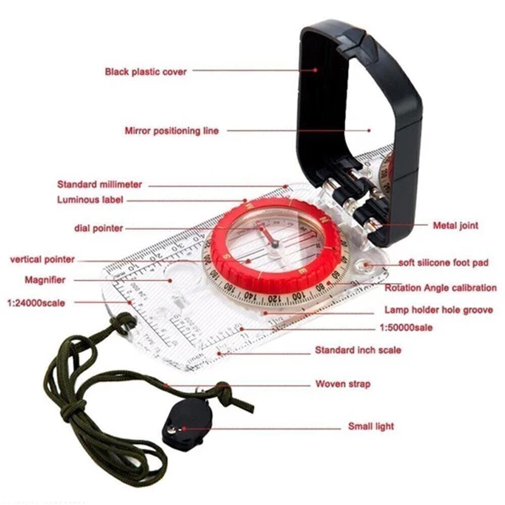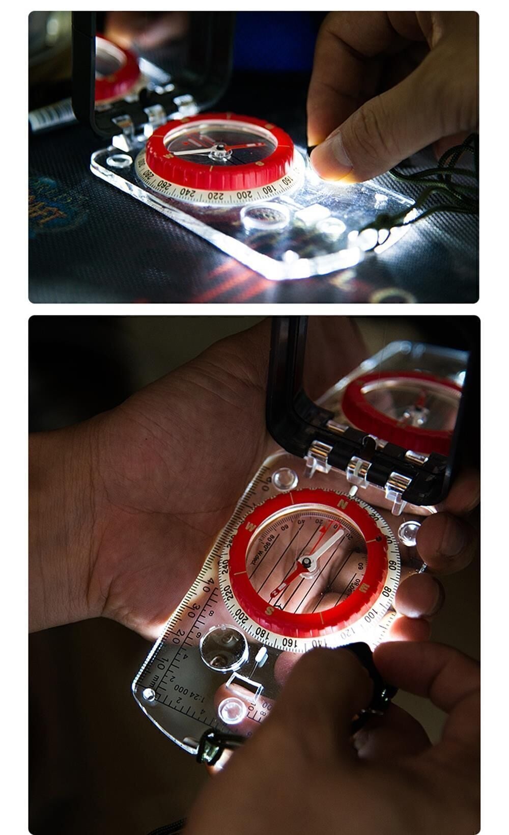 Dış Mekan Işığı, manzara üzerinde gerçek bir etki için konum çizgisine sahip bir aynaya, kalibrasyona ve her yerde kullanabileceğiniz bir döner işaretçiye ve bir dikey işaretçiye, harita okumak için bir büyüteç ve kolay okuma için küçük bir lambaya sahiptir. ortamlar karanlık.