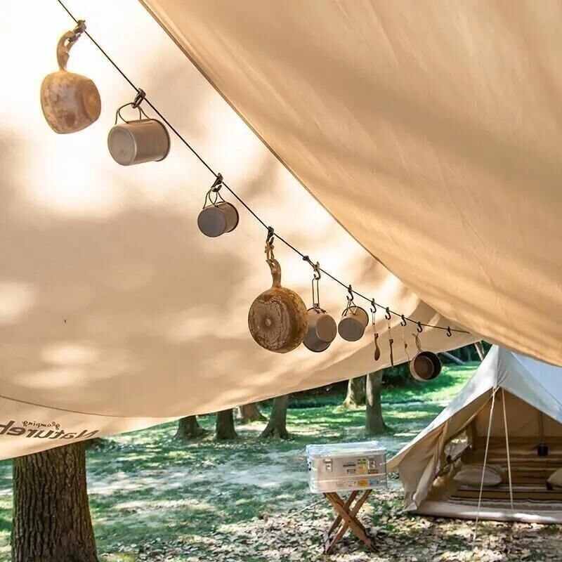 Ayarlanabilir uzunlukta ve sabit kancalı çok işlevli askı ipi. Karabinalar yardımıyla ipi ağaçların arasına kolaylıkla sabitleyebilir, kancalara ekipmanlarınızı asmanız uygun olur, çamaşır ve bulaşıkları kurutabilirsiniz.