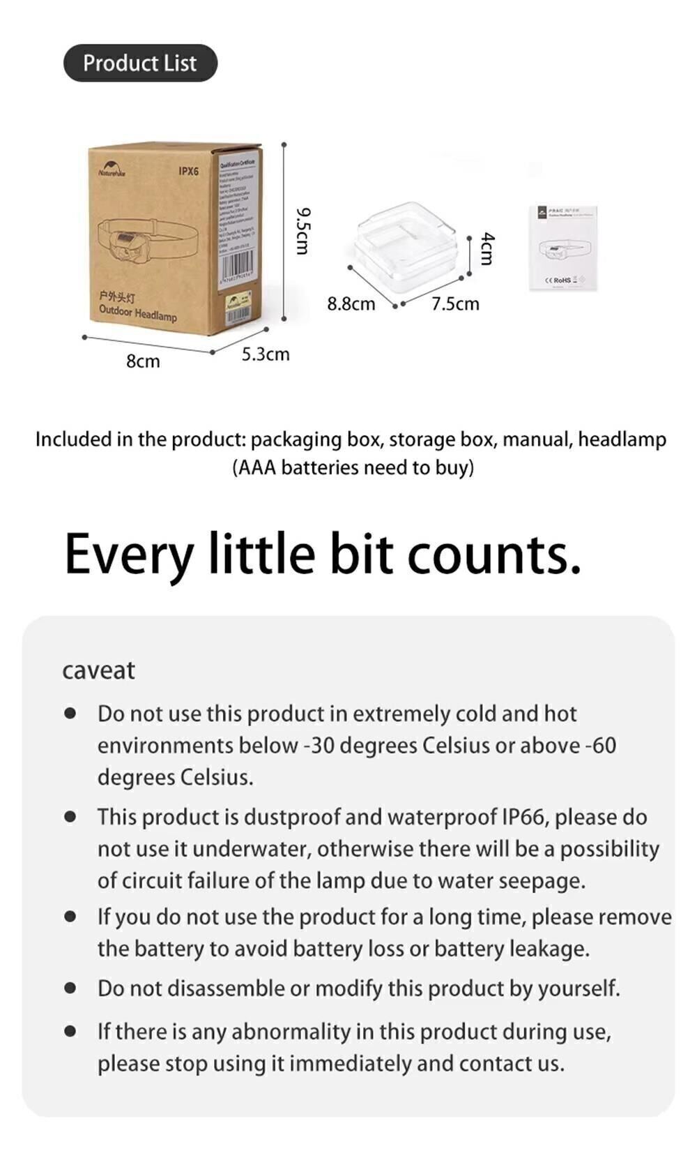 Pil bölmesi üç adet AAA pil için tasarlanmıştır. Pakete dahil değildir. Markalı kafa bandının genişliği ayarlanabilir olup, bu sayede sıkma hissi vermeden kafaya rahat bir şekilde oturması sağlanır. Elastik malzeme, nefes alabilen ve teri uzaklaştıran özelliklere sahip elastik sentetik bir malzemedir.
