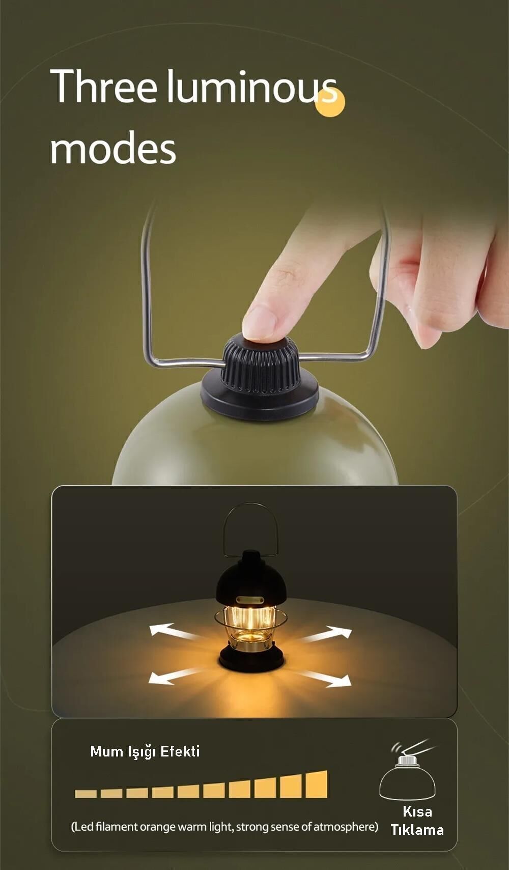 · Toplam uzunluğu 23.5 santim olan şarjlı kamp lambası ışık bölümü ise 6.5 santim yüzeye sahiptir