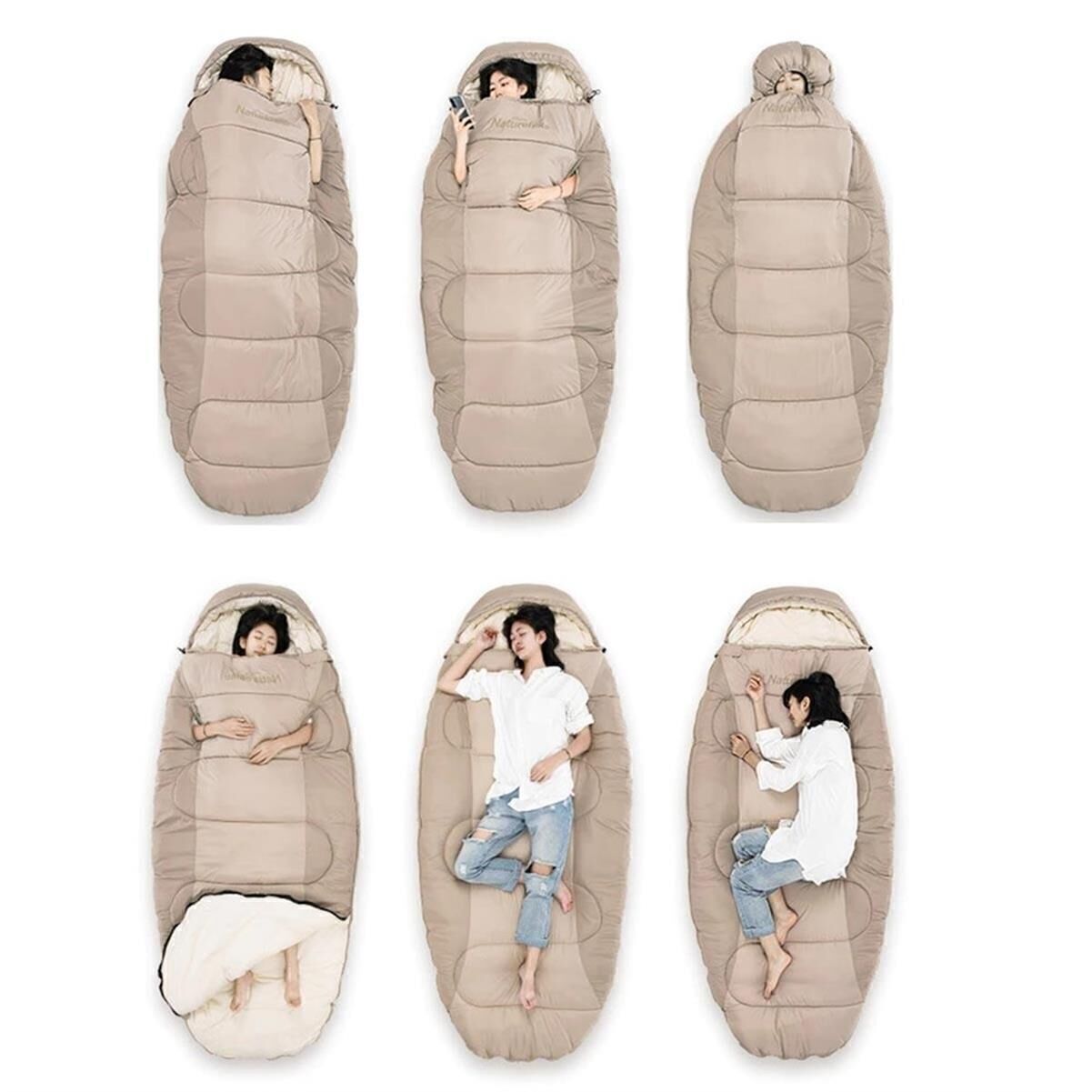 Daha fazla esneklik için büyütülen Naturehike Pamuklu kapüşonlu uyku tulumu. Kollar ve bacaklar açılabilir, böylece uyku tulumu giyerken bile hareket edebilirsiniz!