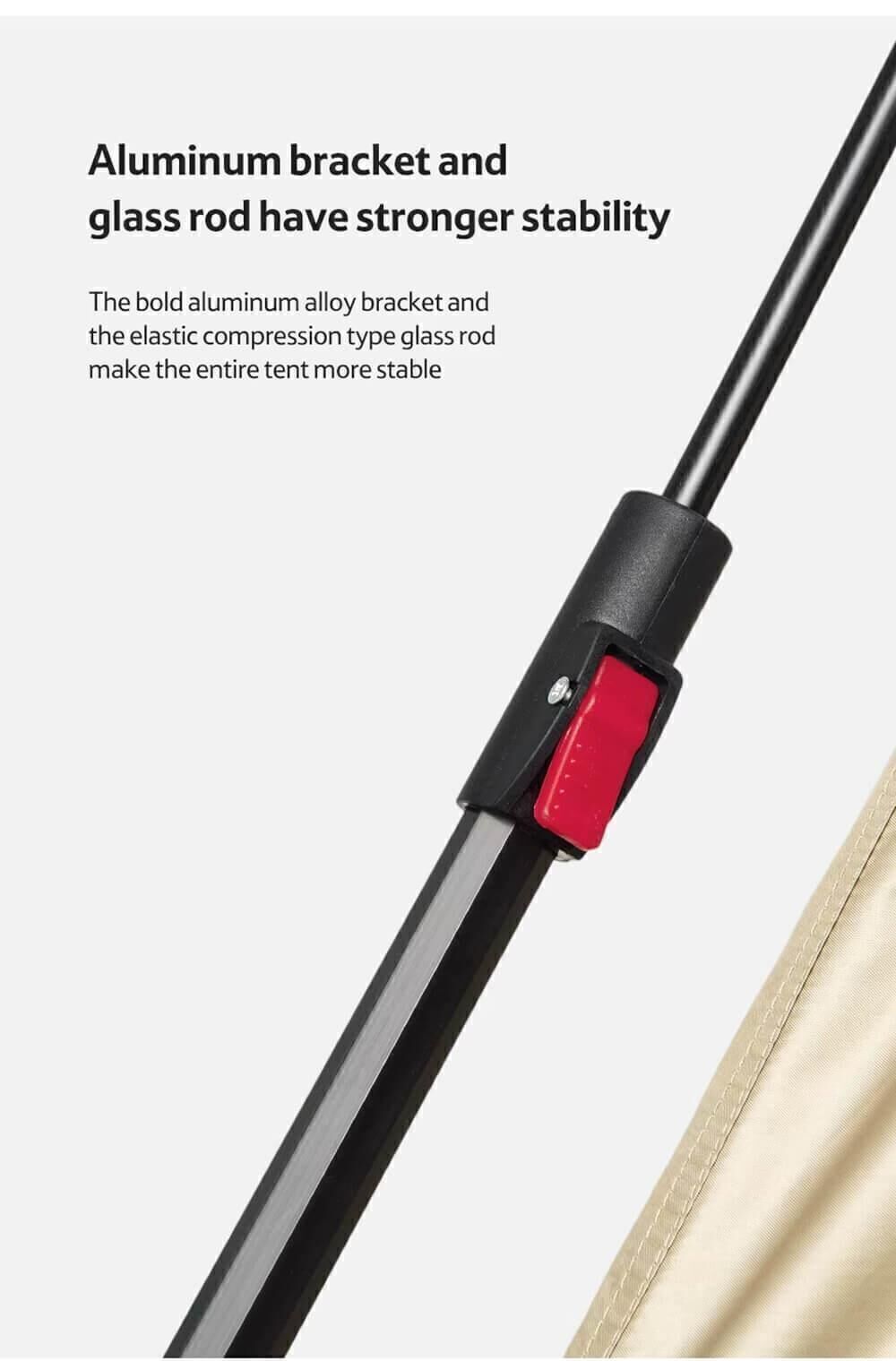 Tasarımda ayrıca kamp duşu/duş başlığını asmak için bir kanca ve tuvalet kağıdı için bir cep bulunmaktadır. Çadırın kendiliğinden katlanan bir çerçevesi vardır. Fiberglas kelepçelerle birbirine bağlanan bir dizi alüminyum tüpten oluşur. Tasarım sağlamdır ve ek rüzgar kesicilerin kullanılmasıyla kuvvetli rüzgarlardan da korkmaz.