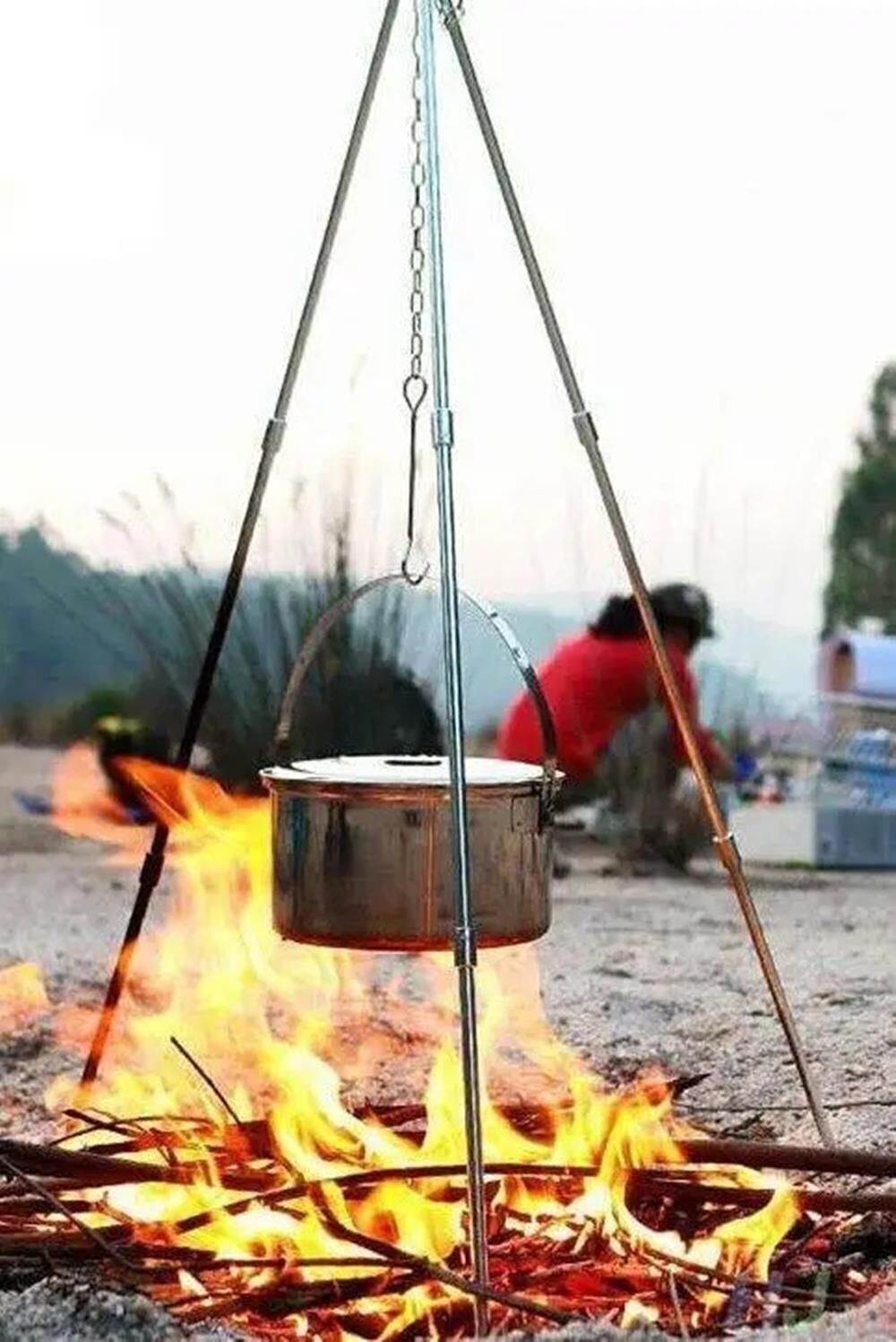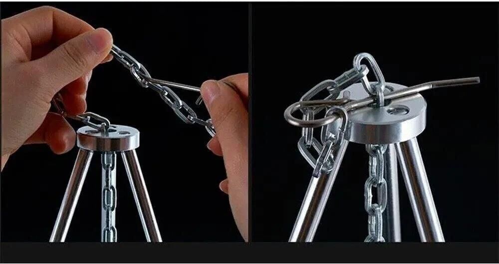Üstte bir noktaya bağlanan üç destekten oluşur ve aynı noktaya bir kazan veya su ısıtıcısı asmak için bir kanca takılır. Tripod kolayca açılabilir ve bir kapakla taşınmak üzere katlanabilir.
